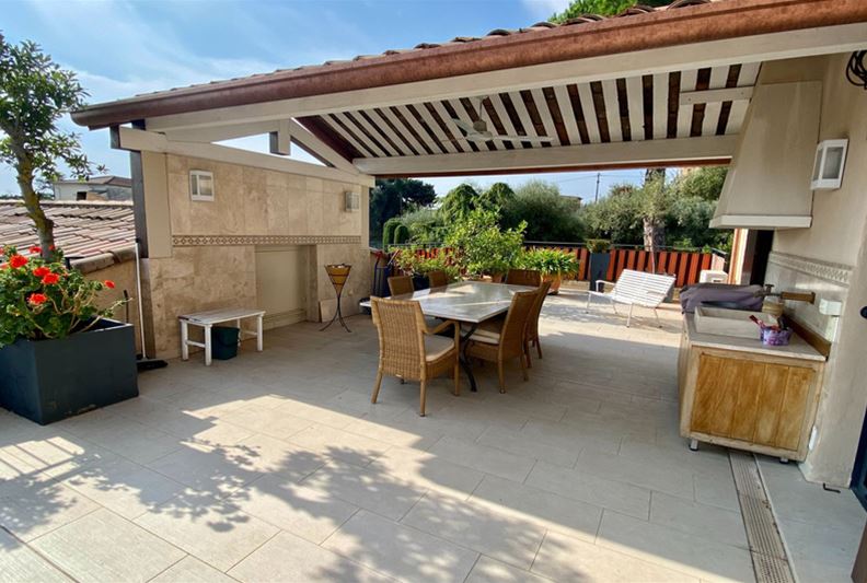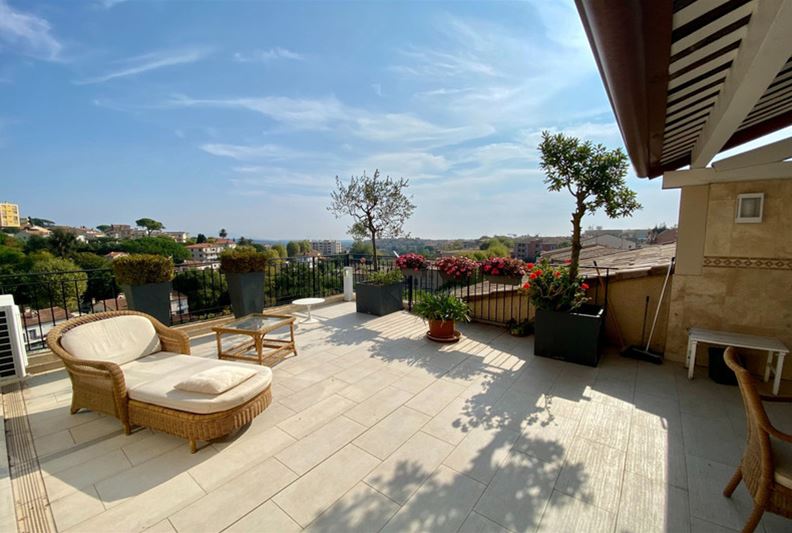 Nær centrum af Vence, med smuk uhindret udsigt over bakkerne og den historiske by, Fantastisk lejlighed på øverste etage i villastil, bestående af en entré med indbyggede skabe, separat toilet, rummelig stue med åbent køkken, soveværelse med indbyggede skabe, brusebadeværelse og toilet, et andet soveværelse med indbyggede skabe og et kontor eller tredje soveværelse med indbyggede skabe og brusebadeværelse. Stor, delvist overdækket terrasse med sommerkøkken, to altaner, kælder og privat udendørs parkering. Garage tilgængelig mod et ekstra betaling.