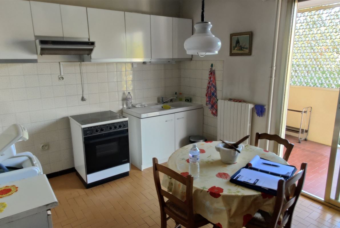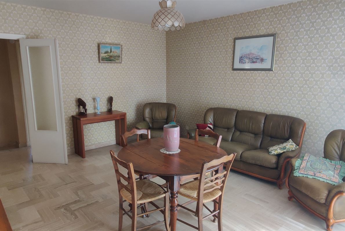 A bright and airy 85 sq m (915 sq ft) 3-bedroom apartment (F4) in a prestigious building, just a 5-minute walk from the town center and shops. Located on the 3rd floor, it comprises three bedrooms, a fitted kitchen opening onto a west-facing terrace, a living room opening onto an east-facing balcony/terrace, a shower room, a separate WC, and an entrance hall. Features include central gas heating, an intercom, an elevator, parking, and a cellar. Some updating is needed.