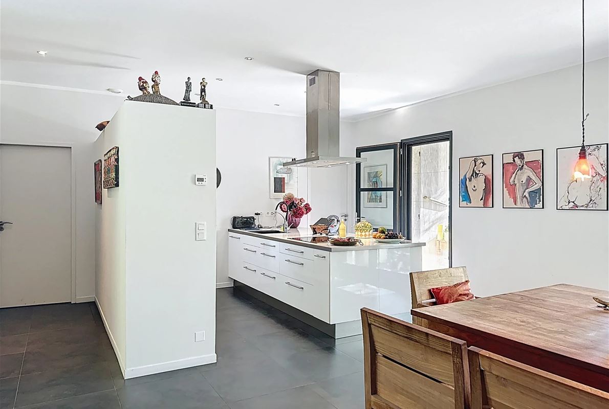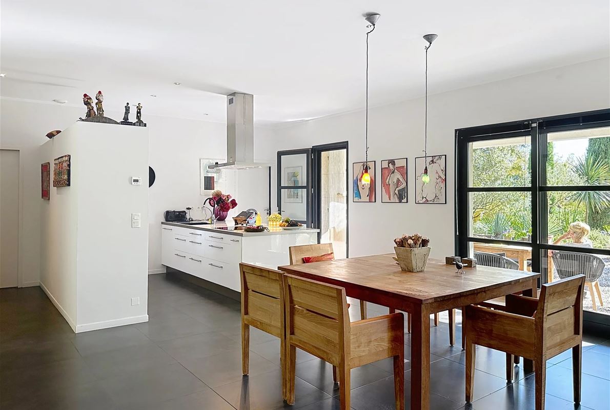Kun få kilometer fra landsbyen ligger denne moderne og komfortable villa i ét plan. Huset er designet og bygget med omhyggelig sans for detaljer og tilbyder enestående komfort. Det har en behagelig stue, en indbydende spisestue og et fuldt udstyret åbent køkken. Store karnapvinduer åbner ud til terrasser, hvilket skaber en problemfri overgang mellem inde og ude. Den rummelige master-suite, komplet med badeværelse og påklædningsværelse, åbner ud til haven. På den anden side af huset er der yderligere to soveværelser og et badeværelse. Der er også et separat gæstetoilet, et garderoberum, en stor tilhørende garage og en dobbelt carport.