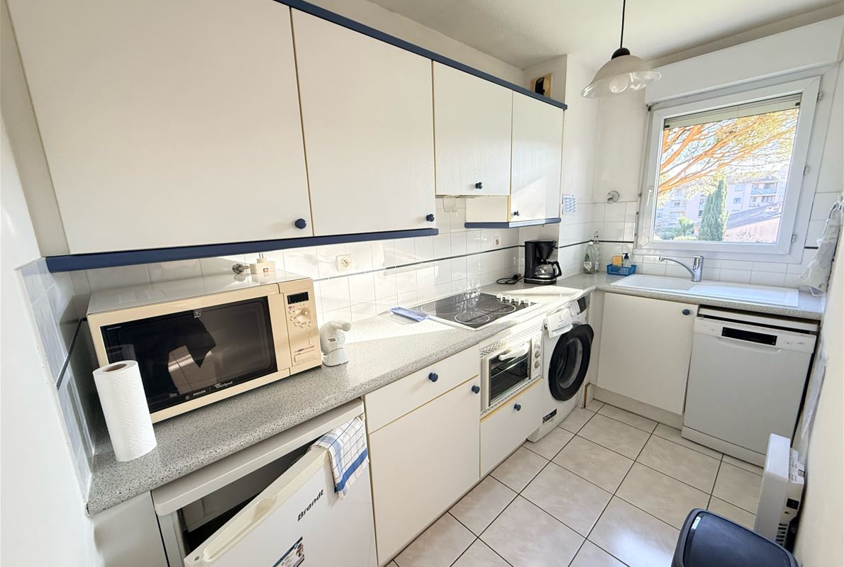In a secure residence with tennis court and swimming pool, a two-room apartment of approximately 45.42m² comprising an entrance hall, a separate WC, a living room with built-in wardrobe, a separate fitted kitchen, a sleeping area with built-in wardrobe, a bathroom with built-in wardrobe, and a bedroom with built-in wardrobe. South-facing terrace. Cellar. Private parking space. Garage available at an additional cost (€25,000).