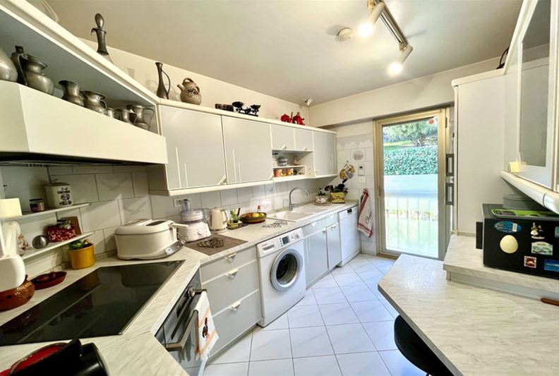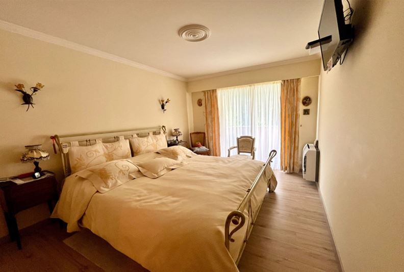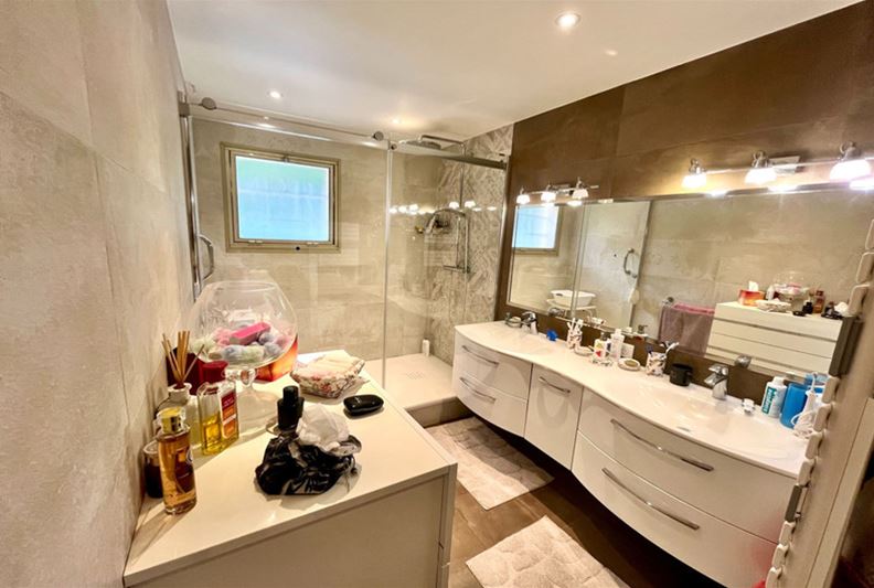 VENCE, close to the city center, beautiful unobstructed view all the way to the sea and peaceful, Spacious apartment on the raised ground floor, including entrance hall, double living room, independent equipped kitchen, two large bedrooms each with their own shower room – Italian shower/ WC, WC, dressing room, and closets. Terrace, 2 cellars, and 2 private parking spaces. - Possible to divide into 3 rooms + independent studio - - Generous spaces, high-quality finishes -