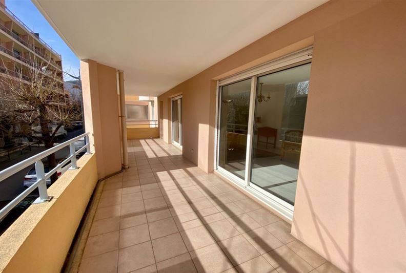 VENCE, downtown, in a high-end residence with a swimming pool, tennis courts, and a caretaker, spacious apartment comprising four main rooms converted into three: entrance, large corner double living room, separate equipped kitchen, beautiful bedroom with its own shower room/WC, and a second bedroom, bathroom, WC, and plenty of closets. Large corner terrace and double garage of 30 m².